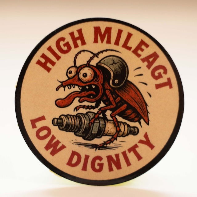 ヴィンテージホラー×アメリカン・バイクカルチャーの香り漂う「HIGH MILEAGE LOW DIGNITY」ステッカー。 ヘルメットをかぶったハエがスパークプラグにしがみつく、どこかコミカルで皮肉な一枚。 “走り続ける奴ほど、品位なんて気にしない”──そんなメッセージを感じさせる、ロッカー魂あふれるデザインです。 防水・耐候タイプで、 車・バイク・ギター・ノートPC・工具箱・スポーツバッグ・ヘルメットなど、 どこに貼っても雰囲気がグッと上がるアイテム。 ヴィンテージパーツ好き、ホットロッドカルチャー、ガレージ系ファンに特におすすめです。 仕様 サイズ:約8cm × 8cm(丸形) 防水・耐候加工 屋外使用OK MADE IN JAPAN(オリジナルデザイン) ご購入特典 ¥1,500以上のご注文で 国内送料が無料! まとめ買いでガレージやツールボックスを一気にカスタムできます。 どこか狂気じみた笑顔のハエが、スパークプラグにしがみついて爆走── “HIGH MILEAGE LOW DIGNITY(走行距離は高く、品位は低く)” そんな皮肉とユーモアを詰め込んだ、ガレージカルチャー魂のステッカー。