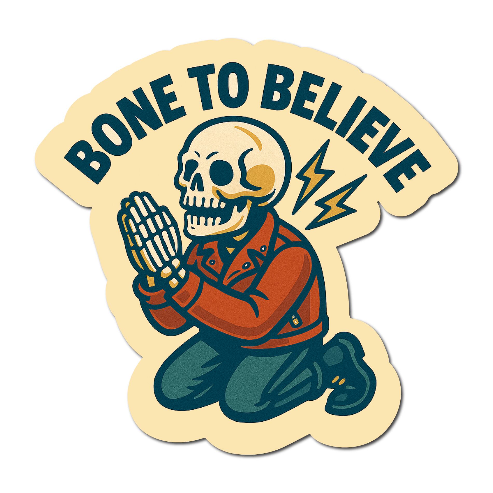 「BONE TO BELIEVE」の文字と、赤いレザージャケットを着た祈るスカルがインパクト抜群。