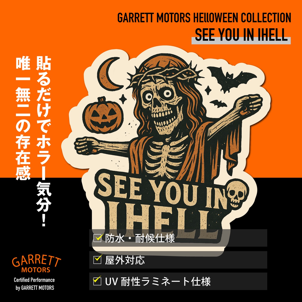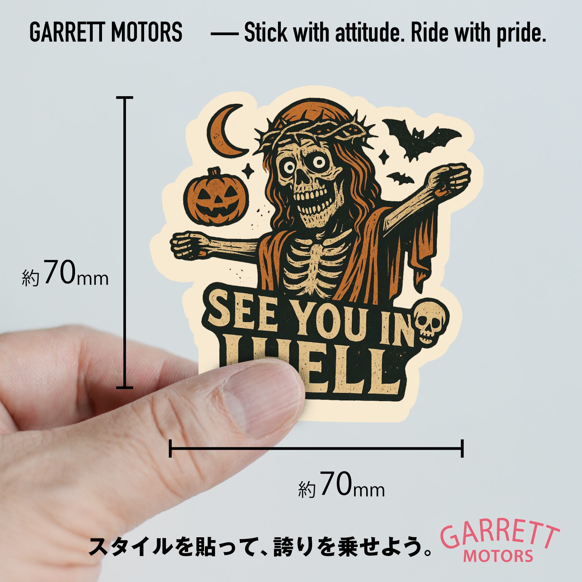 強烈なインパクトで視線を奪う「SEE YOU IN HELL」ステッカー。