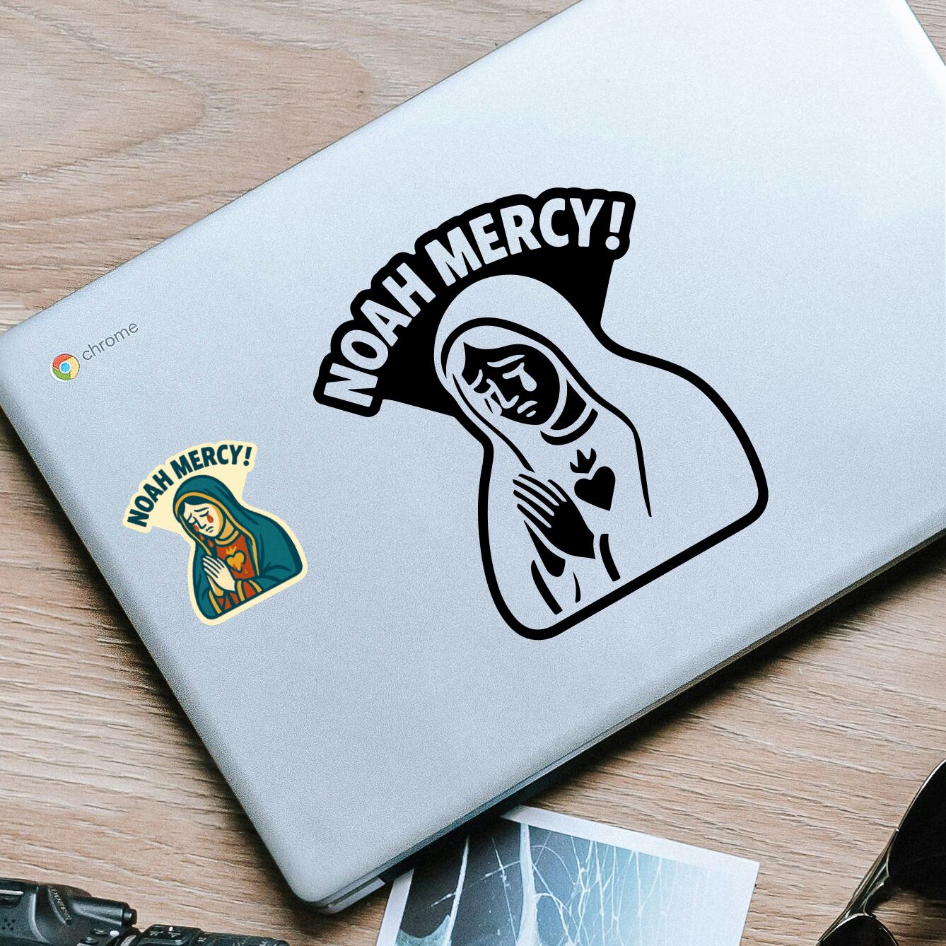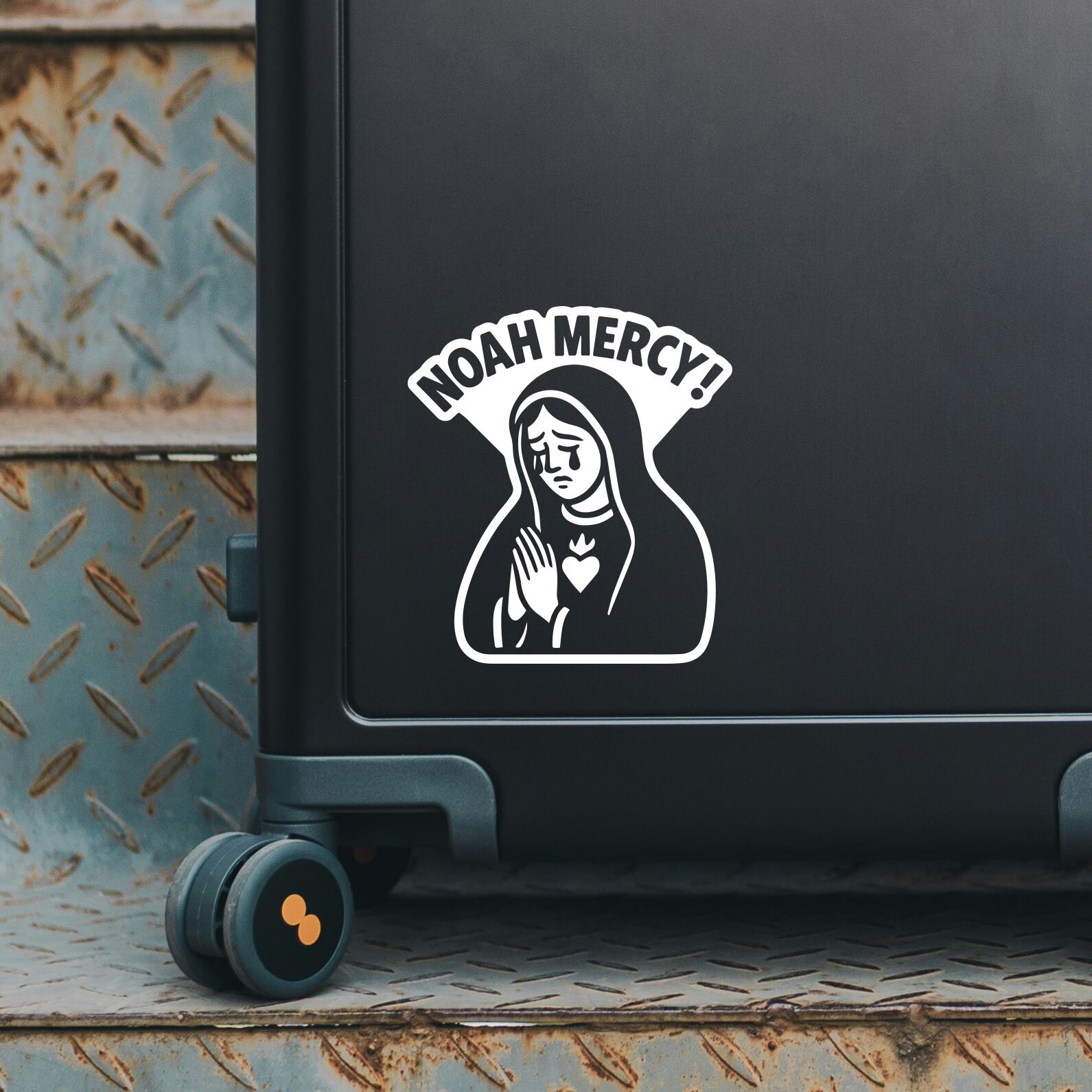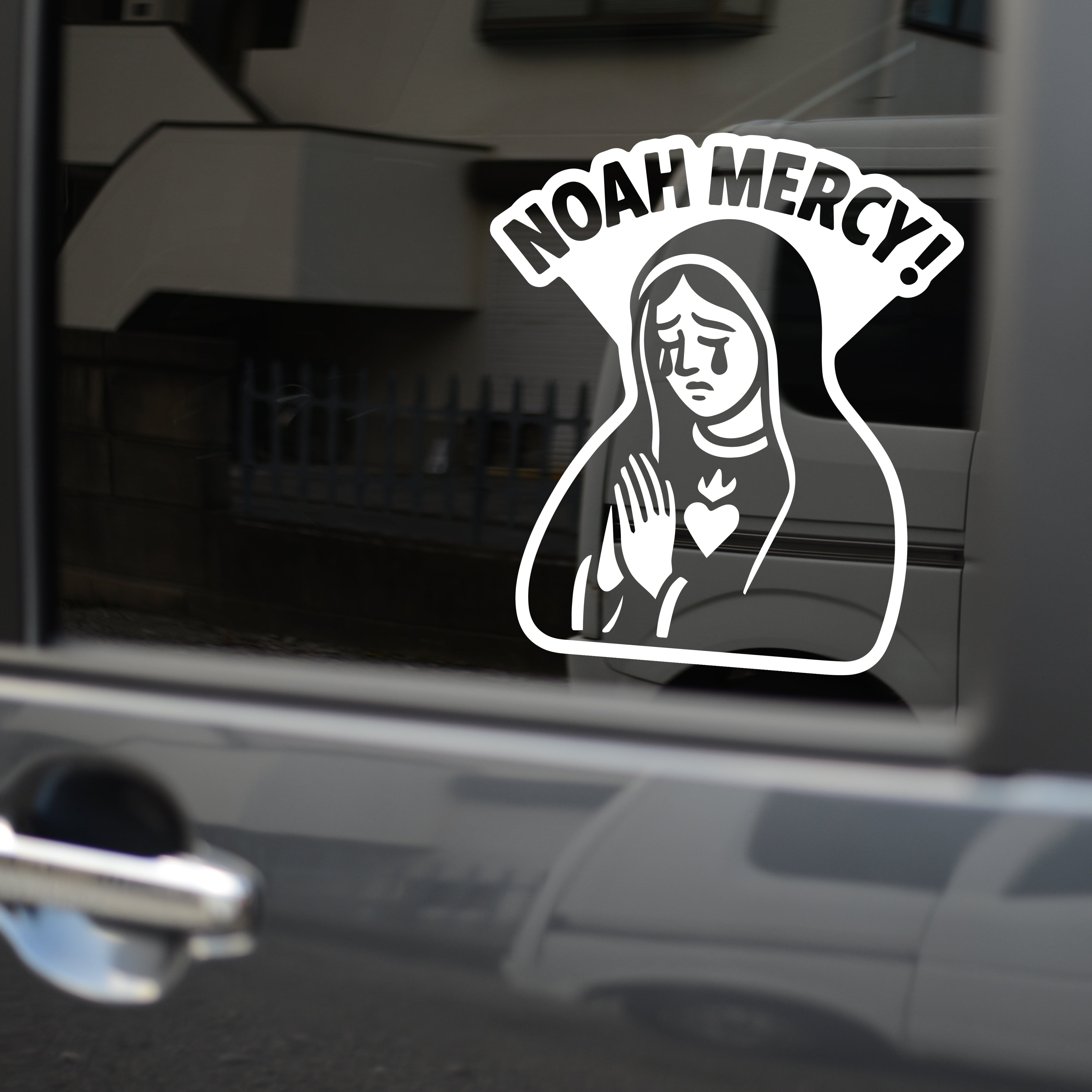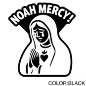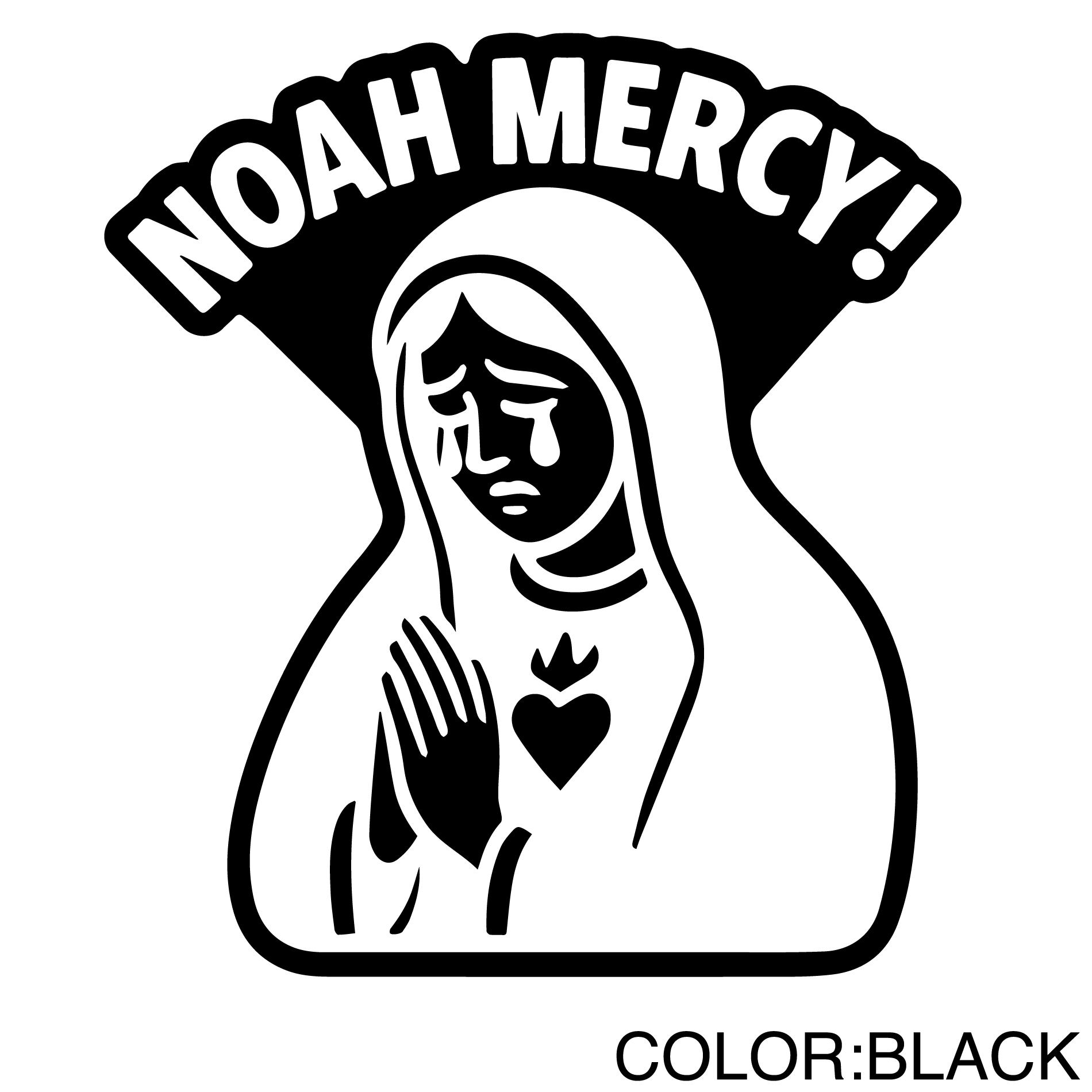「NOAH MERCY!」は、聖母マリア風イラストと皮肉の効いたフレーズを掛け合わせた、インパクト抜群のカッティングステッカーです。