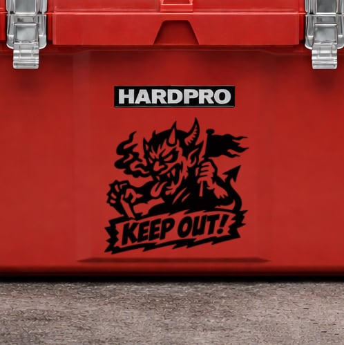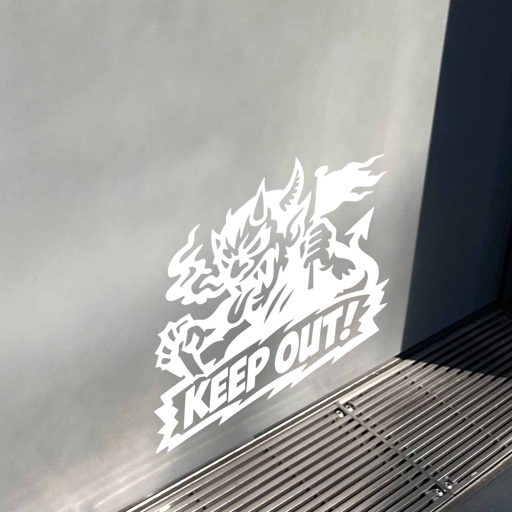 台紙から転写シートごと貼り付け、文字と線画部分のみを残すカッティングデカール方式を採用しています。背景が残らないため、フェンス・倉庫扉・工具箱・ガレージ壁面など、さまざまな素材や色の面に対応します。